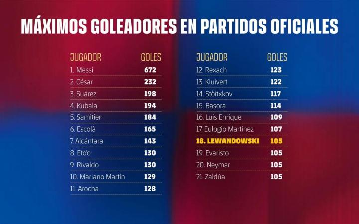 105球追平内马尔,莱万升至巴萨队史射手榜第18位